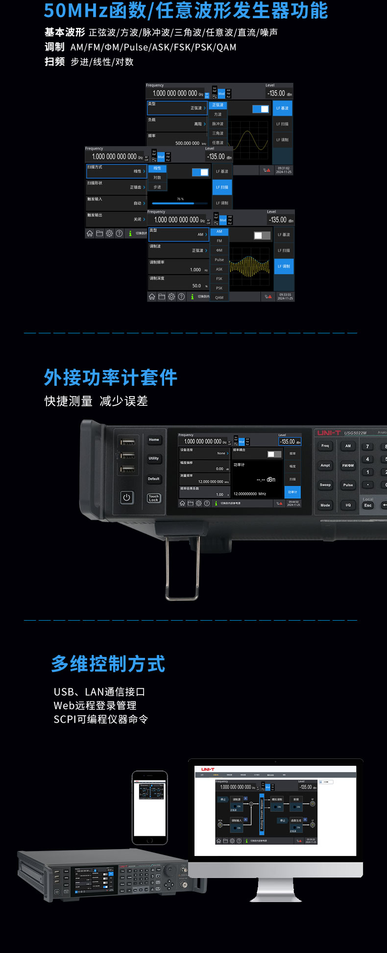 USG5000M系列整機(jī)采用2U標(biāo)準(zhǔn)高度機(jī)箱,輸出頻率高達(dá)22GHz,頻率分辨率小于1mHz,較寬的頻率覆蓋范圍,可以用于本振上變頻或者連續(xù)波阻塞的測(cè)試。在功率輸出方面,最大可輸出+25dBm及-60dBc雜散抑制,配合我們精確的步進(jìn)衰減器,更適用于微波元器件,它可以為濾波器、放大器、接收機(jī)等器件及模組測(cè)試提供必要的信號(hào)。 USG3000M系列整機(jī)采用2U標(biāo)準(zhǔn)高度機(jī)箱,輸出頻率高達(dá)6.5GHz,頻率分辨率小于1mHz,較寬的頻率覆蓋范圍,可以用于本振上變頻或者連續(xù)波阻塞的測(cè)試。在功率輸出方面,最大可輸出+25dBm及-60dBc雜散抑制,配合我們精確的步進(jìn)衰減器,更適用于微波元器件,它可以為濾波器、放大器、接收機(jī)等器件及模組測(cè)試提供必要的信號(hào)。