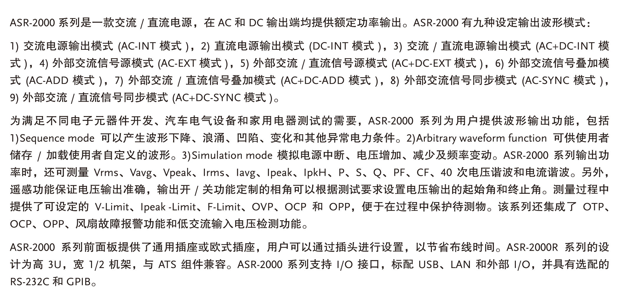 產(chǎn)品標(biāo)簽:臺(tái)灣固緯,GWINSTEK,ASR-2100R,可編程交流/直流電源(AC/DC 1000VA)