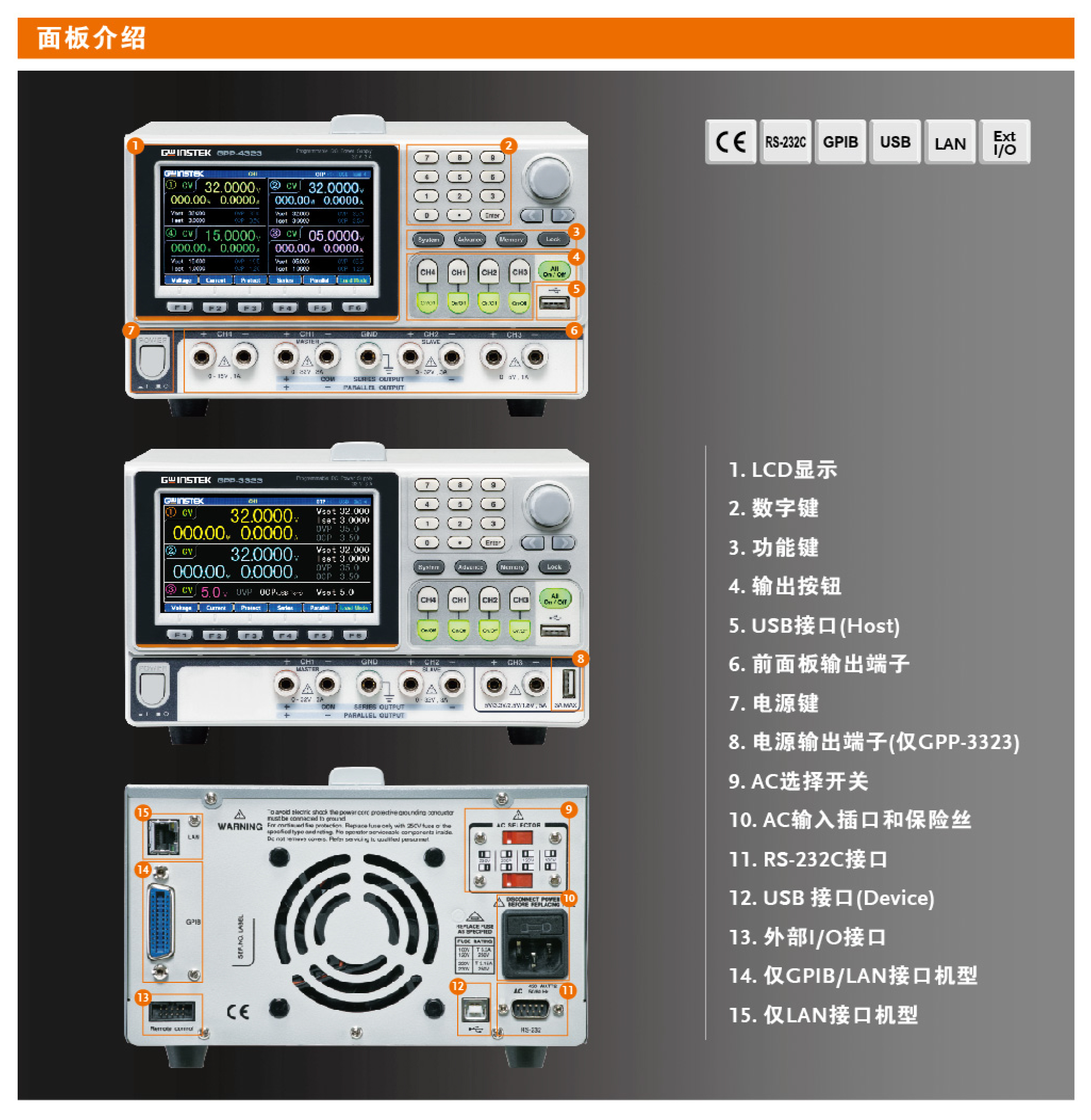 技術(shù)規(guī)格: 4ch,輸出電壓:0~32V(CH1/CH2),0~5V(CH3),0~15V(CH4),輸出電流:0~3A(CH1/CH2),0~1A(CH3),0~1A(CH4),USB/RS232/IO接口