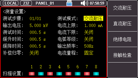 ● 4.3英寸TFT真彩LCD,大屏顯示 ● 4/8路,多路輸出 ● 支持AC/DC耐壓測試,IR絕緣測試,接觸測試,功能豐富 ● 全隔離及浮地輸出,抗干擾能力強 ● 交流耐壓(ACW):5kV/20mA ● 直流耐壓(DCW):6kV/10mA ● 絕緣阻抗(IR):2.5kV/10GΩ(可選配到5kV) ● 緩升時間/緩降時間/測試時間/補償歸零,多種功能靈活設(shè)置 ● 智能判定:超上限/超下限/電弧/超充電下限(聲光指示) ● 過壓/短路保護/快速放電/接地失效多重保護,提供極致安全體驗 ● 防電墻技術(shù)隨時偵測回路,杜絕觸電傷害,保障人員安全 ● 過壓、過流保護,電流底數(shù)清零功能,使用更加簡便快捷 ● 可存儲100個測試文件,每個文件可存儲20個測試步驟,測試模式可任意組合 ● 遵循標準SCPI和Modbus通信協(xié)議,方便組件自動化測試系統(tǒng) ● 配有工控用的Handler (PLC) 接口,連接電腦用的RS-232C(可選配RS485)和LAN接口