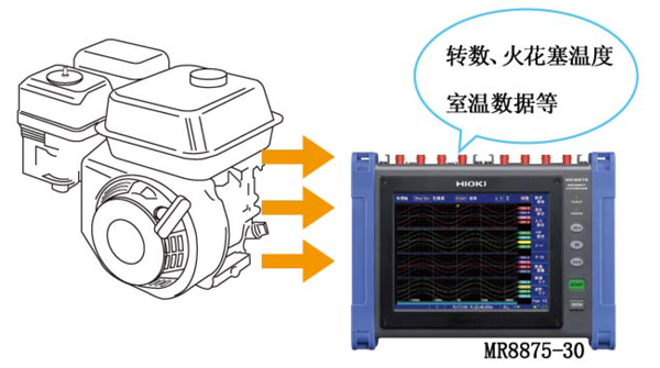 使用存儲(chǔ)記錄儀 MR8875-30 可記錄所裝引擎的轉(zhuǎn)數(shù)·火花塞溫度·室溫?cái)?shù)據(jù)等。