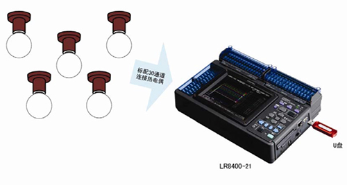 使用具備耐壓性強(qiáng)的輸入部分的數(shù)據(jù)記錄儀LR8400-21,進(jìn)行含充電部分在內(nèi)的部分(測(cè)量照明用具零部件的耐久試驗(yàn)時(shí)的溫度測(cè)量等)的溫度測(cè)量。